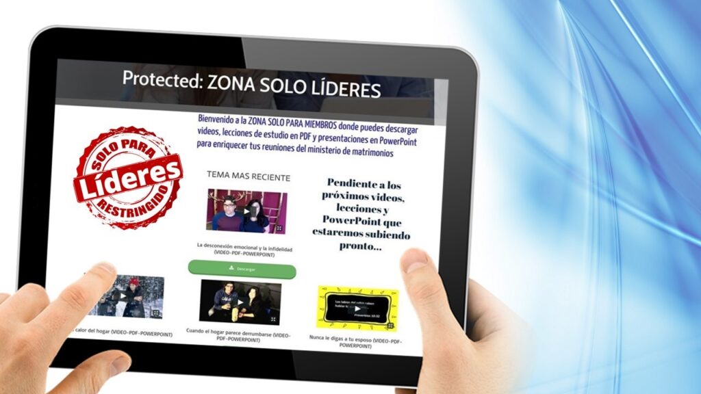 -Tendrás acceso ilimitado a la ZONA SOLO PARA LÍDERES donde podrás descargar videos, lecciones en PDF y presentaciones en PowerPoint que te servirán como herramientas para tus reuniones del ministerio de matrimonios.